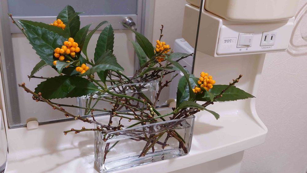 冬至梅の残りの小枝と実家で貰ってきた千両を洗面所に🎍