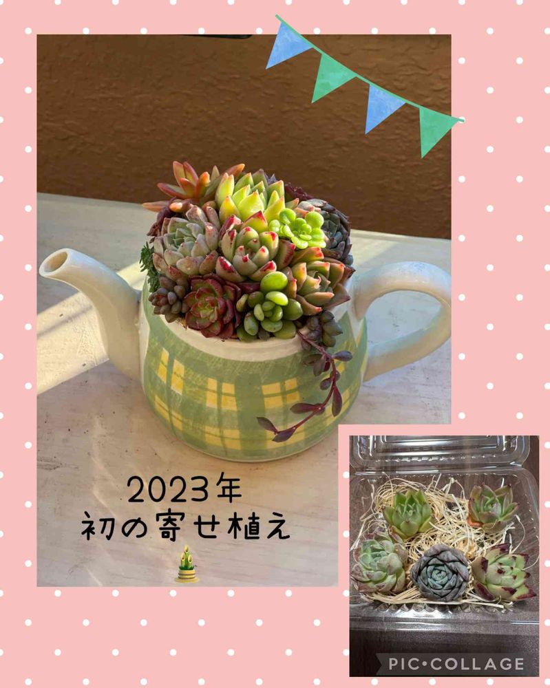 急須セットの🫖に穴あけて、お家で育った多肉を集め、最後にルビネかグリネ悩み😅