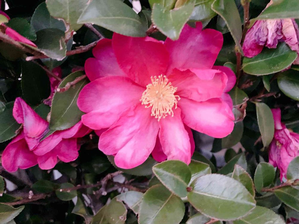 サザンカの季節です。垣根をサザンカのピンクが彩っています。