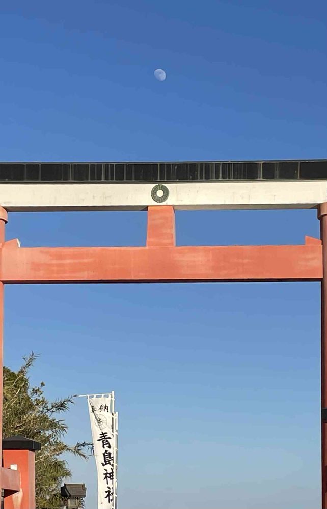 📝この写真画像は、青島神社の入り口に建っている大きな⛩鳥居の上に出ている◯白い月などの様子を写したものデス🐶