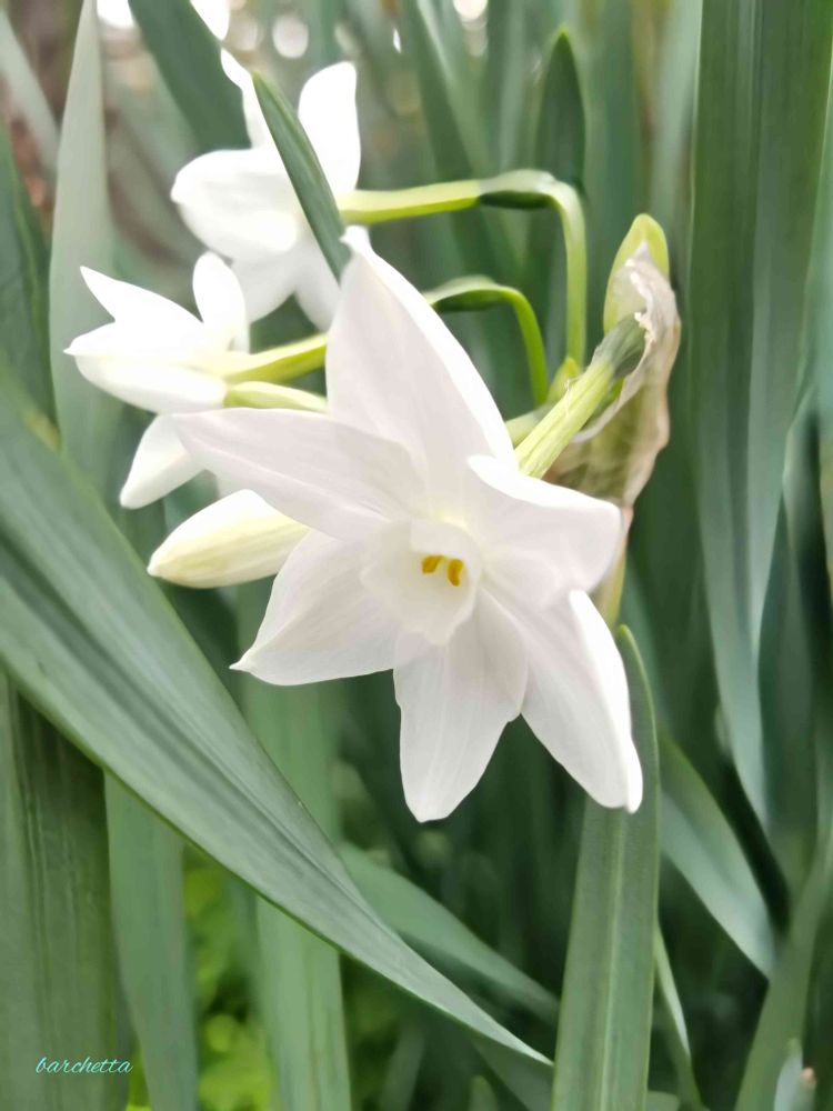 地中海沿岸地方原産のスノーホワイトとかペーパーホワイトとか呼ばれてるやつだと思います。日本の水仙より早く咲く寒咲き種だそうですがこの辺では同時に咲いてるのをよく見かけます。
