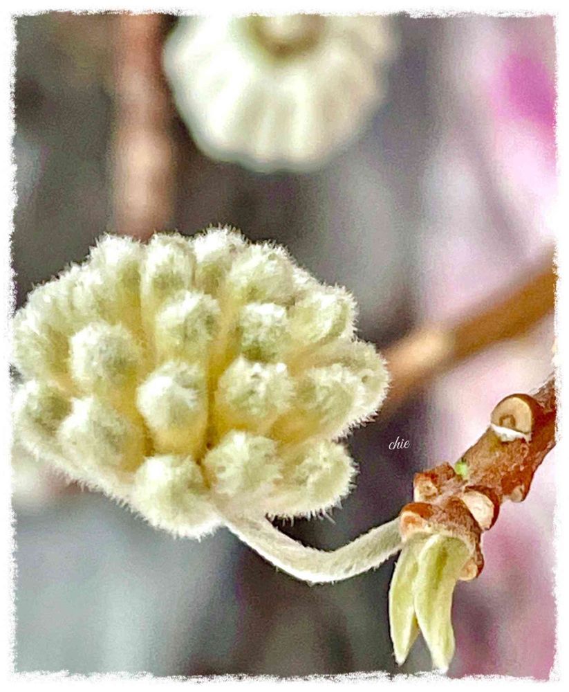 梅の花が咲く頃、新芽が出る前に可愛い花を咲かせます(こちらは蕾)樹皮に含まれる繊維は古くから和紙の原料に使われてきました。この福々なのが愛らしい♪̊̈♪̆̈🐈🤍
