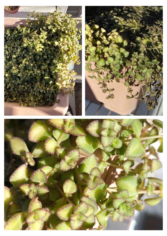生育旺盛で、余った土を入れたプランターの端にかたまりでのせておいたらプランターの縁をのぼり垂れ下がっていました。