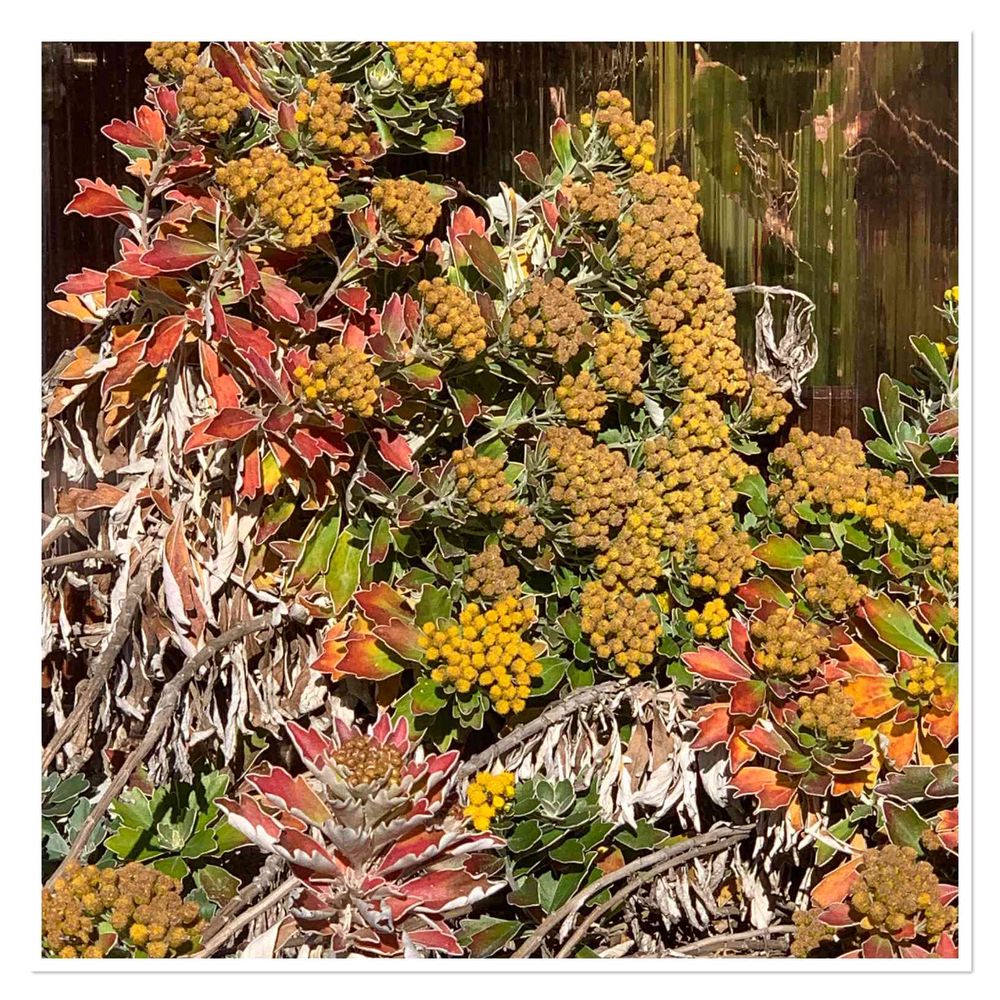 磯菊の花が終わりを告げるかの如く、茶色掛かってきて、葉っぱも紅葉して来て、緑から黄色赤と、グラデーションと言うより、コントラストが際立っている気がします。