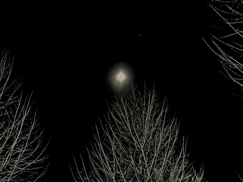 商店街から、銀杏と月🌕をモノクロで撮りました。