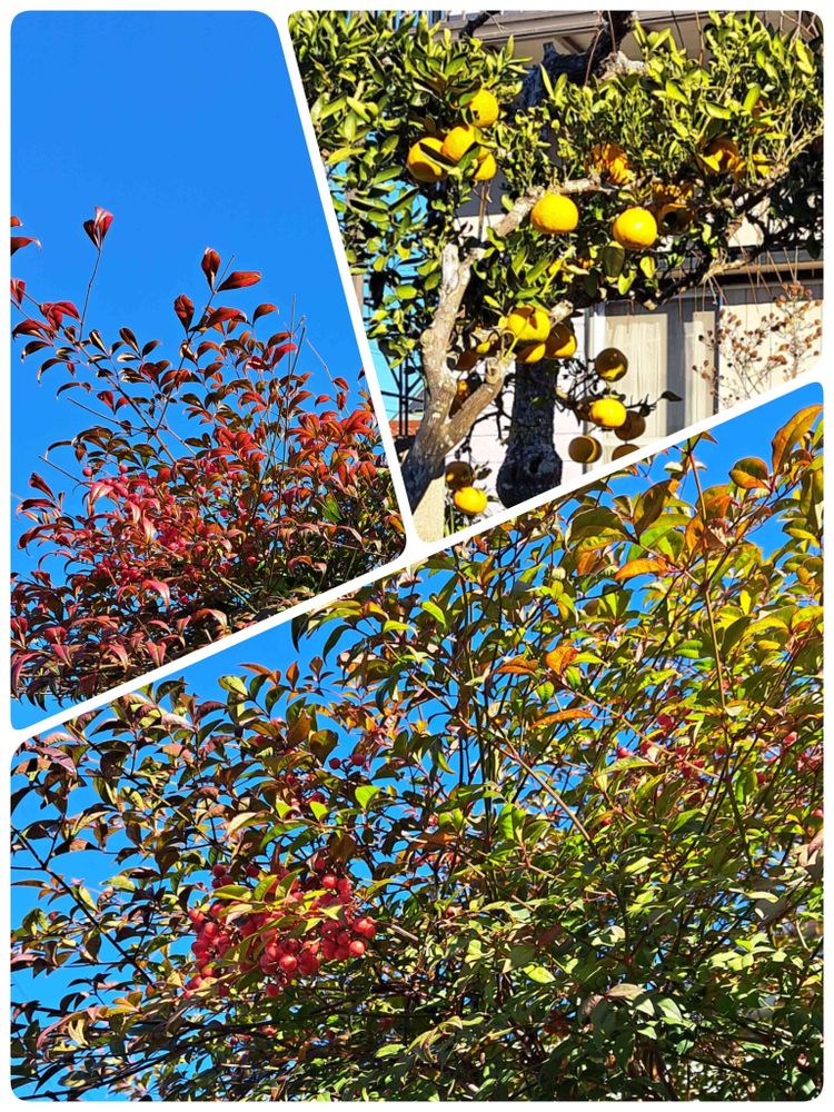 椿さんの柑橘類,青空,南天の実の投稿画像