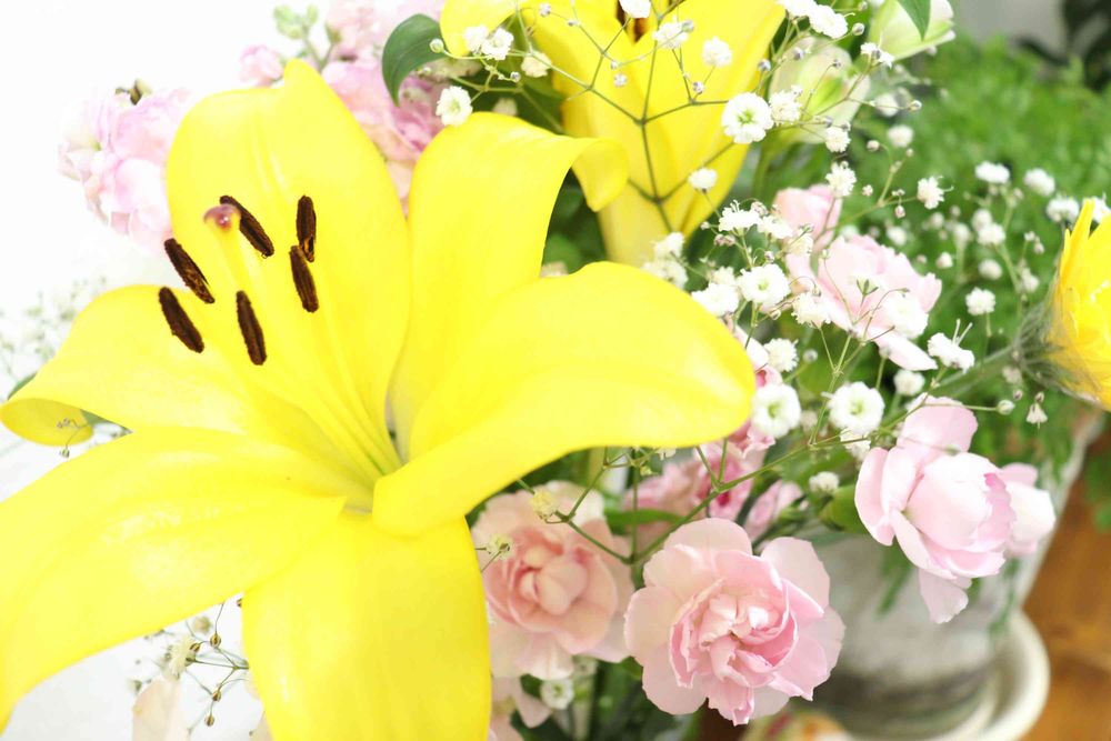 お花💐プレゼントかな…?黄色いユリとベビーピンクのカーネーション?ミニバラかしら…🤔