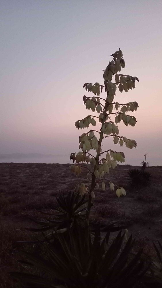 今朝は水面はモヤ水平線上は雲 境目はわからない 気温は-2 ユッカの花も寒そうです⛄😱⛄😱