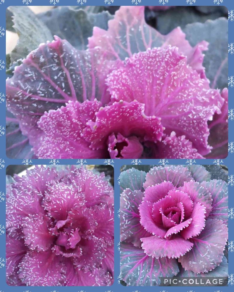 霜が降りてカチンコチンに凍っていた我が家の葉牡丹💜💚❄
