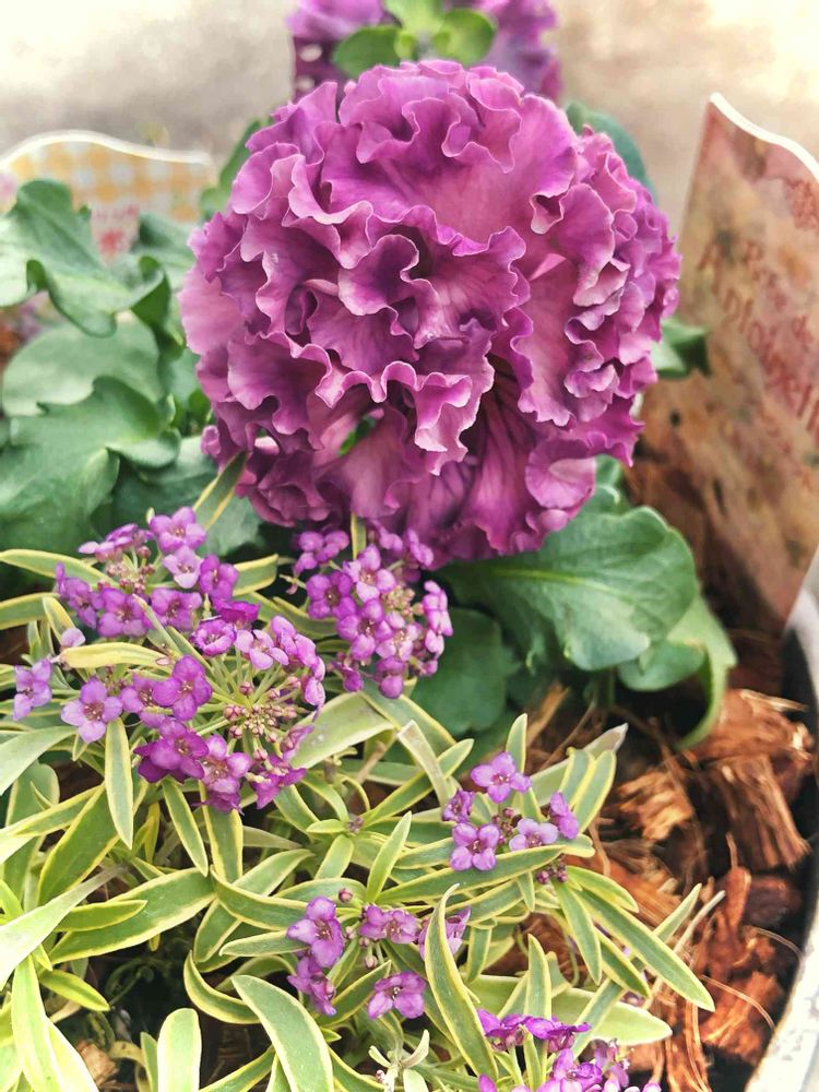 斑入りアリッサムハッピーボンボンと見切れて映っていないのですがシエルブリエとの寄せ植えです✨