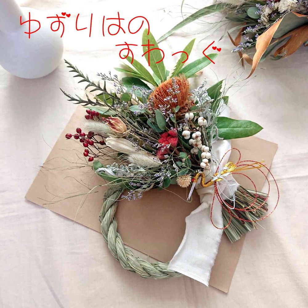 ゆずり葉にフォルモーサヒバ稲穂赤や白の実物を束ねたすわっぐ