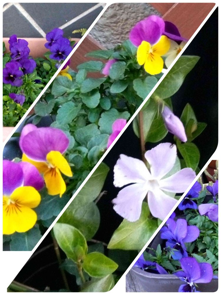 左上↖️(ビオラ) 左二段目も(ビオラ) 右下↘️ 三段目(ツルニチニチソウ) 右下↘️四段目(パンジ~)