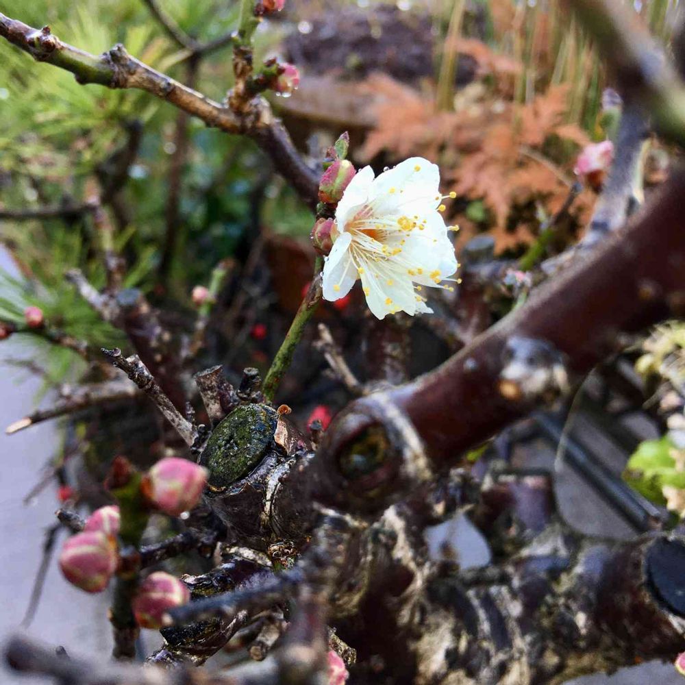 バルコニー小庭の盆栽の梅が1輪咲きました。