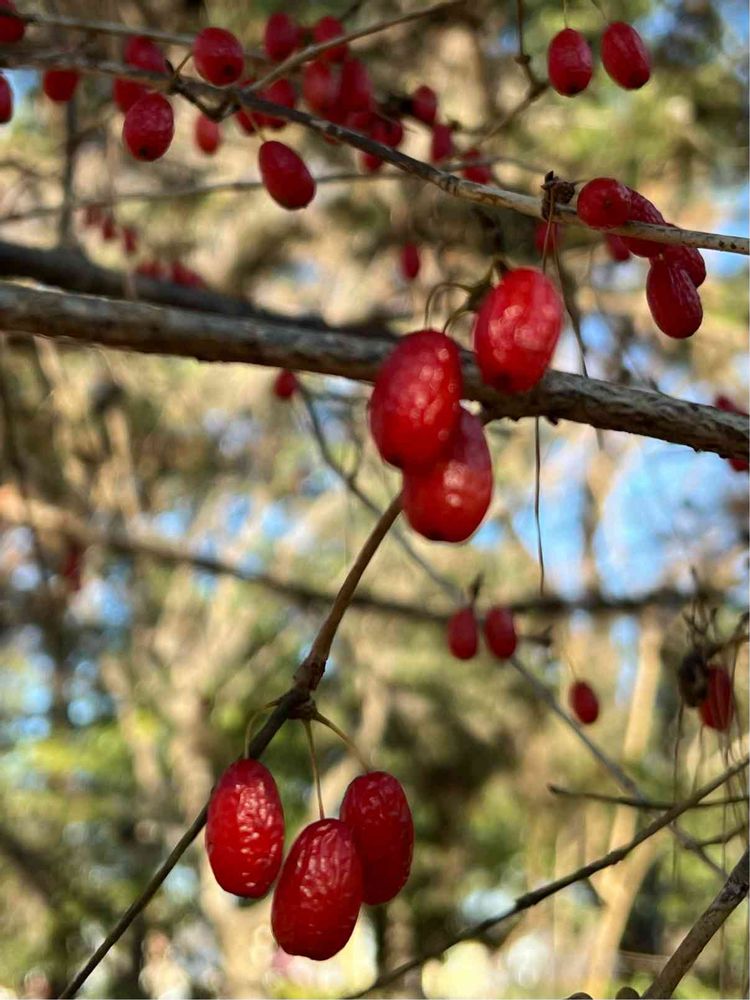 お墓参りの際、必ず立ち寄る多磨墓地小金井門。サンシュユが林立しています。ちょっと(かなり)皺々になっていましたが、まだまだ艶ピカ。