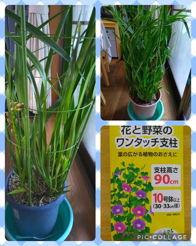 シンビジュームの葉垂れが酷く鉢を動かす度に葉が傷つくので、正解かどうかはわかりませんが、『花と野菜のワンタッチ支柱』を取付様子をみることにしました。前にもPICしましたが、今年はどうしたことか1鉢だけやたらに花芽が成長中の鉢に新たに2芽増えていた~