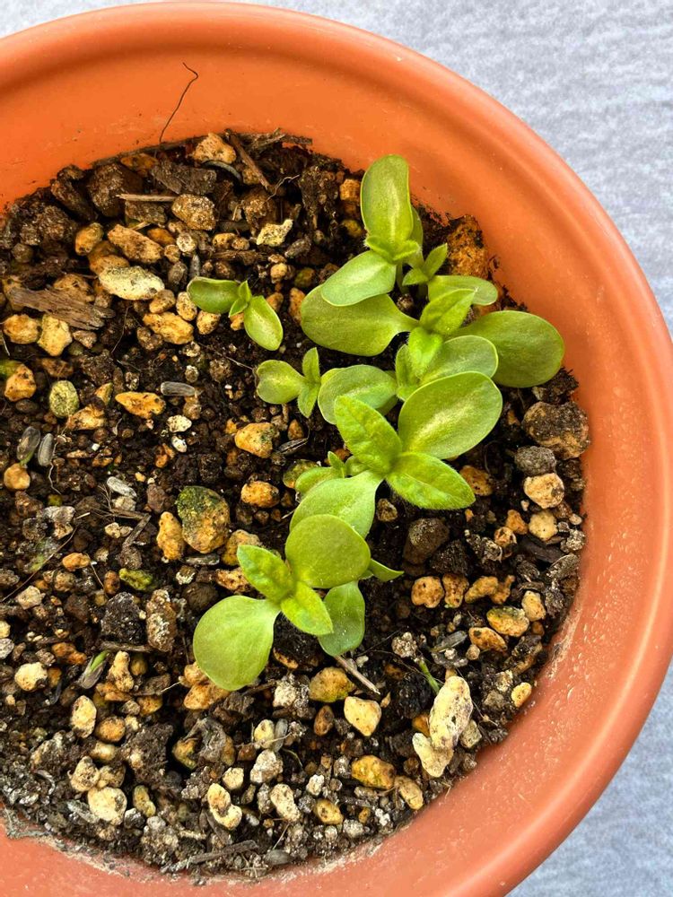 ふと見るこぼれた種から少し発芽していて、よく見ると発芽しかけのもいっぱい😂