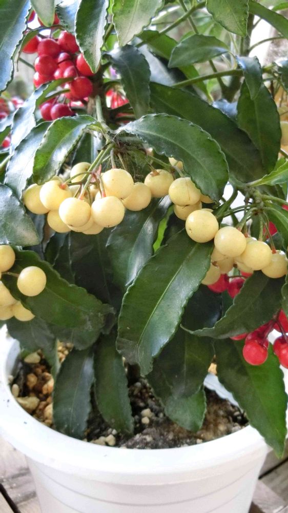 今日のお花 マンリョウ(万両)は 真っ赤な実が一般的ですが これは シロミノマンリョウ(白実万両)です。