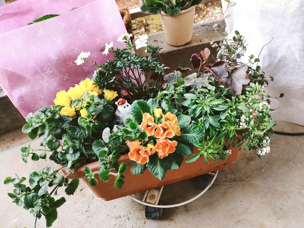 プリムラ3株植えようかなと思ったけどスペースの問題で2株になりました。右側手前は小さなバスケットに植えていた3つそのままそおーっと植え替え。(白スイートアリッサム、極小輪ビオラリトルコニー、ピーチフロマージュ🍑)左手前は白のバコパ、最近花つきが悪い。1週間くらいしたら日当たりの良いところに置いて、どんどん咲いてほしいなぁ。