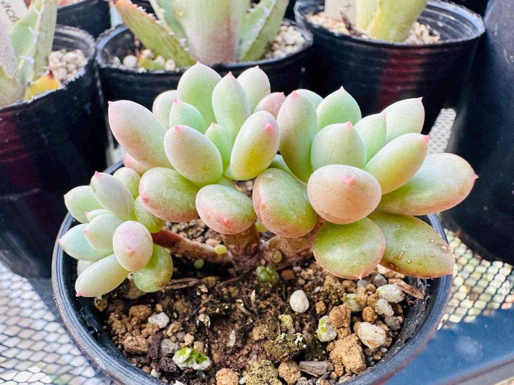 ほんのりピンクに色付き、綺麗で健強な子です☺️夏に葉っぱ2枚になるまで水を切ってしまい、本当に申し訳ない子でもあります💦