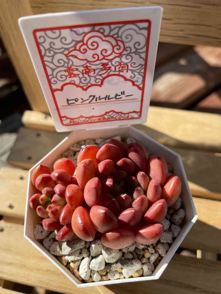 まだありましたよ!八角形の鉢ではないですが、雲南多肉のものがあと2つか3つあったと思います。紅葉していない別の生産者さんのもありましたが、色と札に惹かれてこちらをお迎えしました。