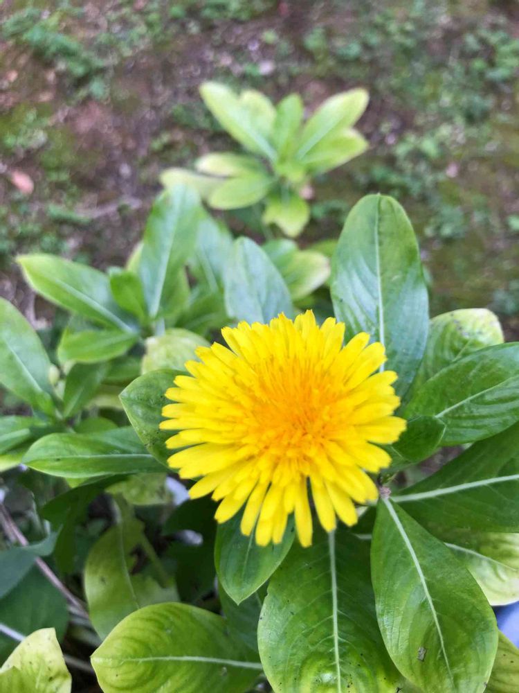 太陽に向かいニチニチソウの葉の間から顔を出しているタンポポ🌼