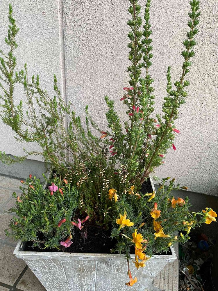 初恋草2つ・カルーナ・エリカ。。昨年寄せ植えで使っいたエリカも加えてツンツン葉っぱばかりの寄せ植えです😂🌿🪴