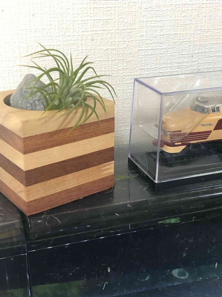名前違ってたら教えてください。我が家唯一のエアープランツ。紅葉しないし、なーんの変化無し。置き場を考えた時、ここかなーと夫のめだかの水槽セットの上に置いてあげた。寄木作りの鉢カバー。