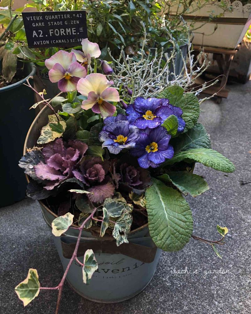 プリムラジュリアンブルーエッジ、ビオラアルスノーヴァ、葉牡丹、カロケファルス、ヘデラを寄せています💜