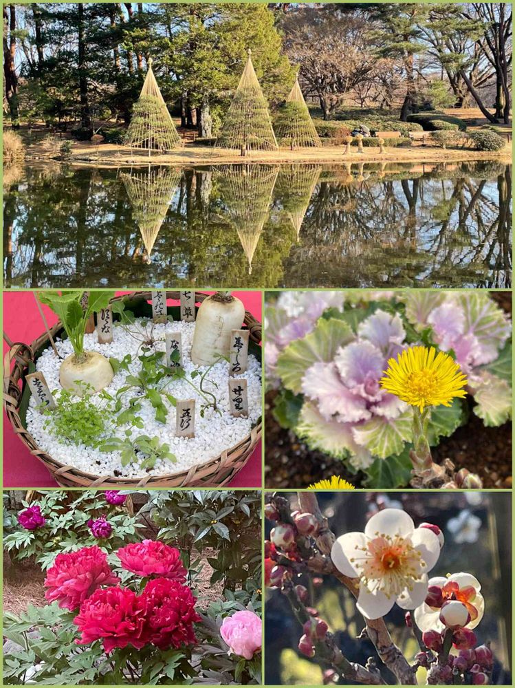 🎍お正月ならではの雰囲気の雪吊りや七草籠、寒牡丹、葉牡丹、梅(冬冬至)