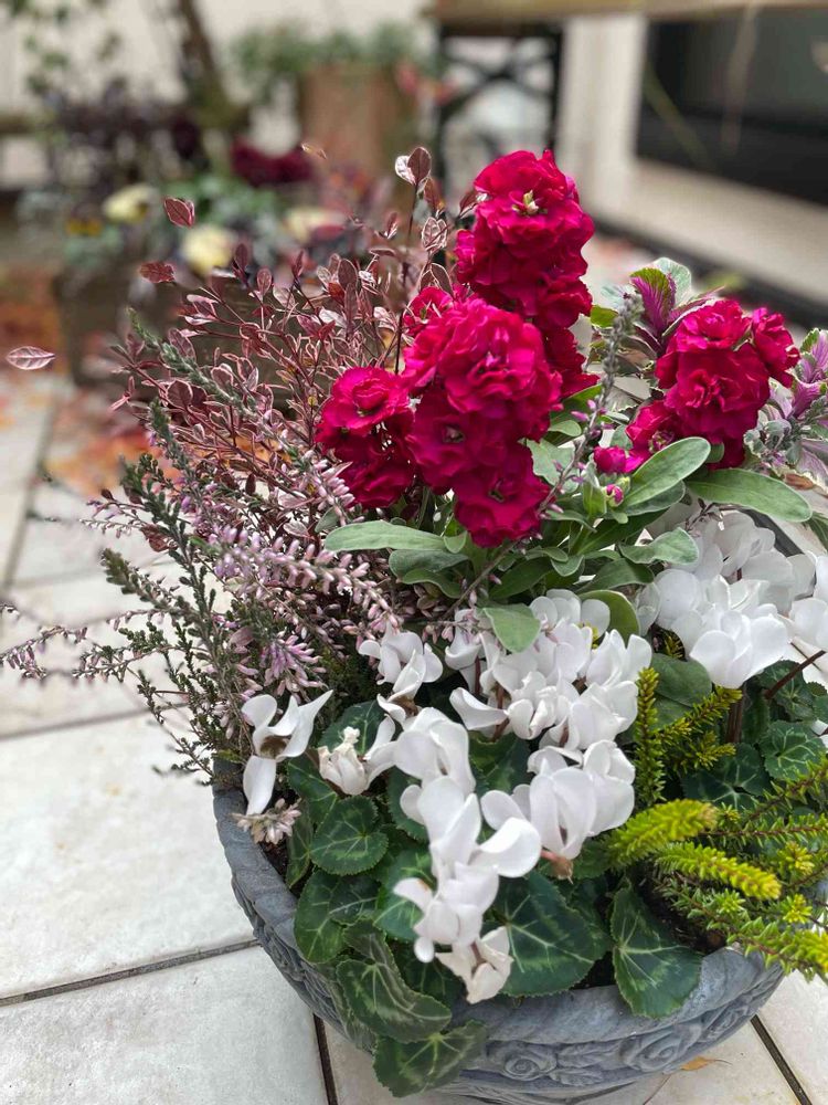 ストックとシクラメンの寄せ植え。