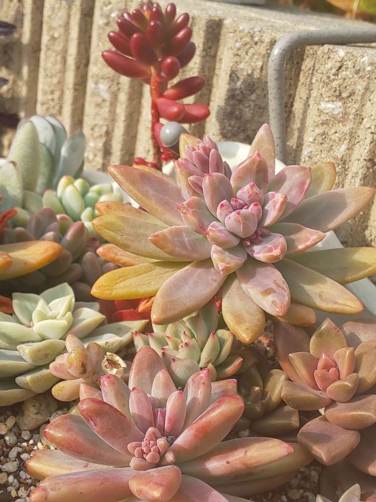普及種ばかりの寄せ植え、さすが強い💪虹の玉が真っ赤っか♥️