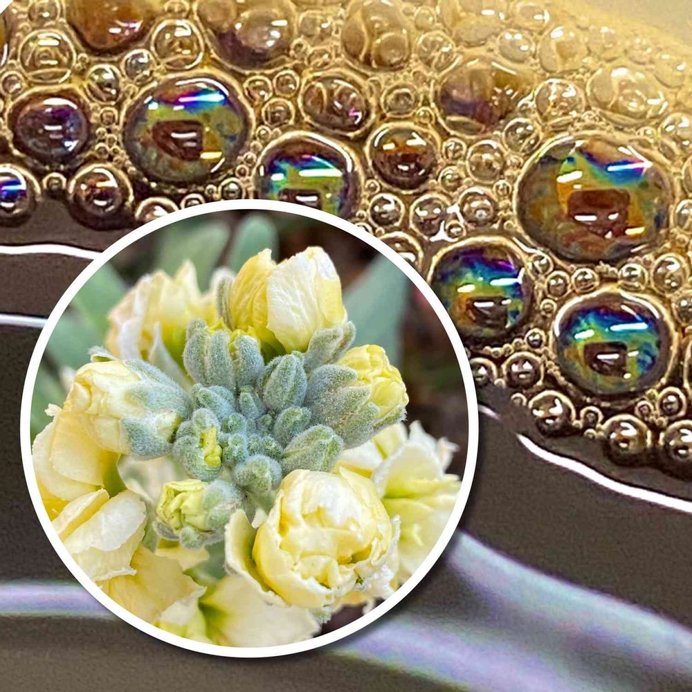 ☕コーヒーの泡ヾ(≧∇≦)がカラフルに素的ですねえ🌈カスタードクリーム色のストックさん💛💛とっても美味しそうなスイーツですね~🥰💛💖