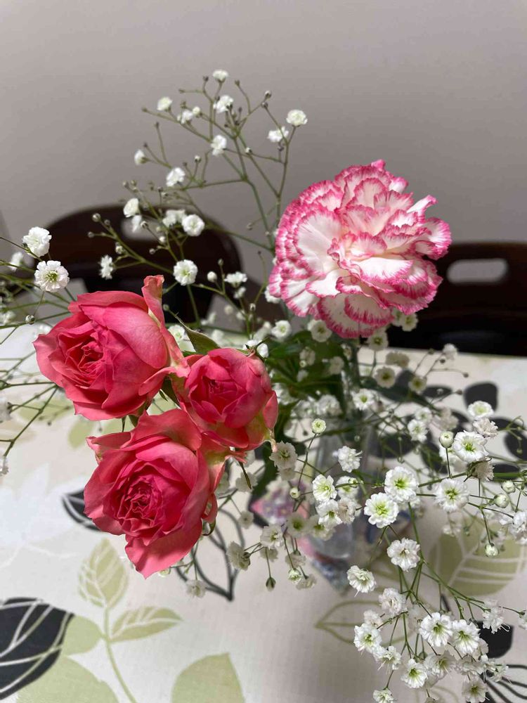 そして縁取りの淡いピンクが可愛いかったカーネーションを食卓に飾りました😃