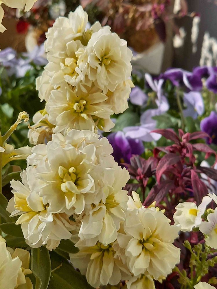 もう1枚…今のベランダに咲くアイボリーのストック🌼