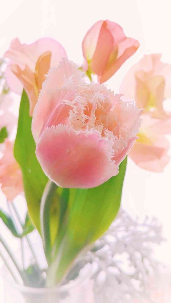 淡いピンクに白いフリンジのチューリップ。ひらひら舞う蝶のようなスイトピーに囲まれて