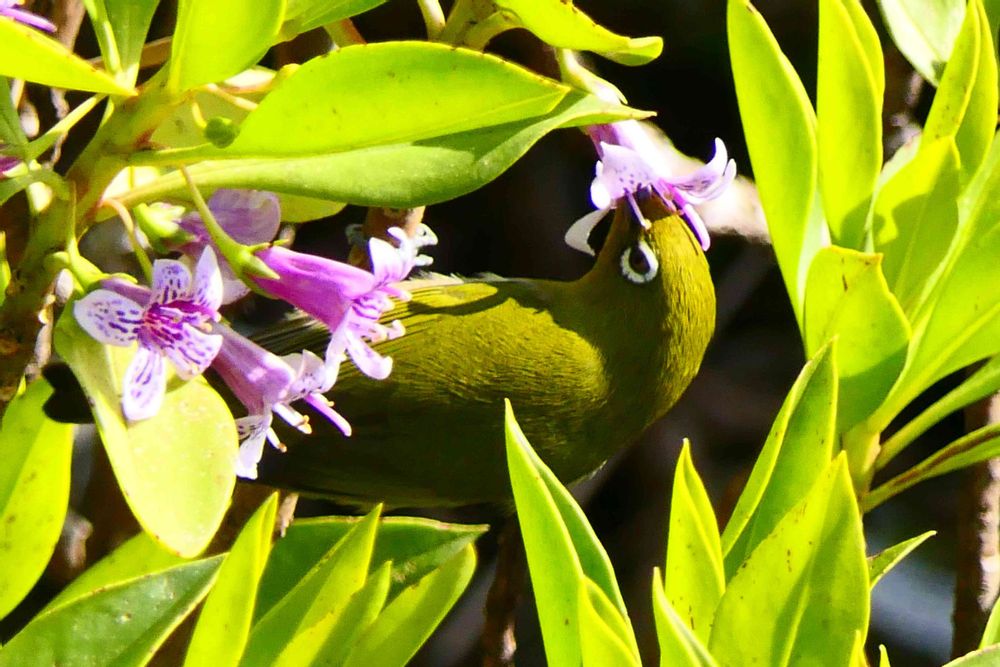 満開のハマジンチョウには、たくさんのメジロが来ていました🎵
