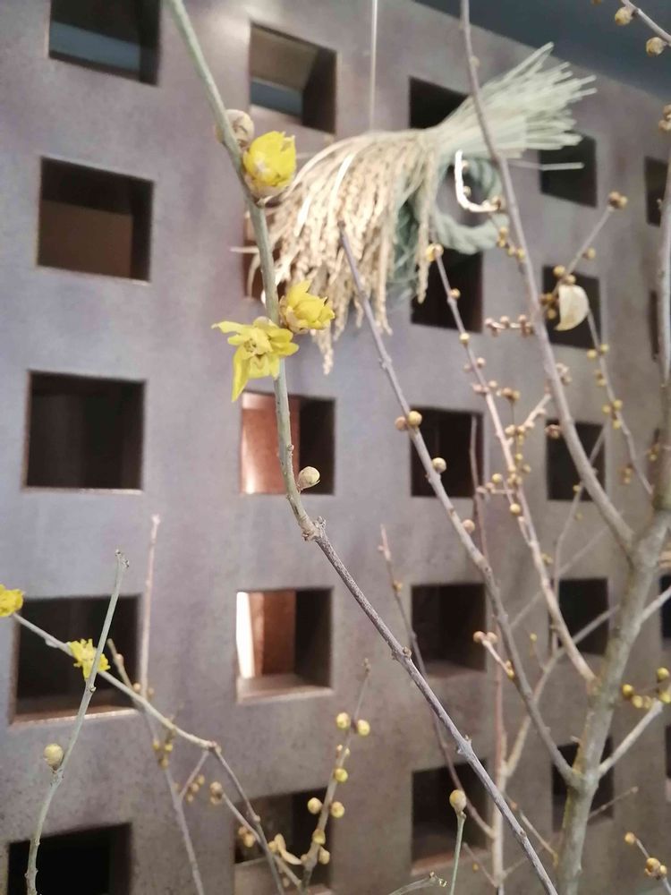 御玄関先に、ぽつりぽつりと咲き始めた仄かに香る「蝋梅(ロウバイ)」を飾っていらっしゃったので、傍にいらしたご婦人に許可を得て、撮影させて頂きました💛