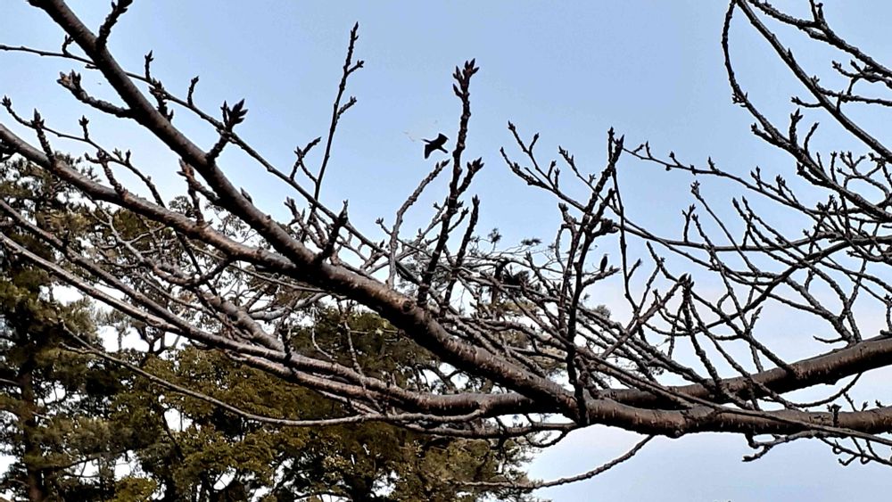 @こつぶ さん、跳んでる鳥から1.5㌢程斜め右下の奥の木に 鵜がとまってます。 小さくてごめんちゃいです。🤭😆