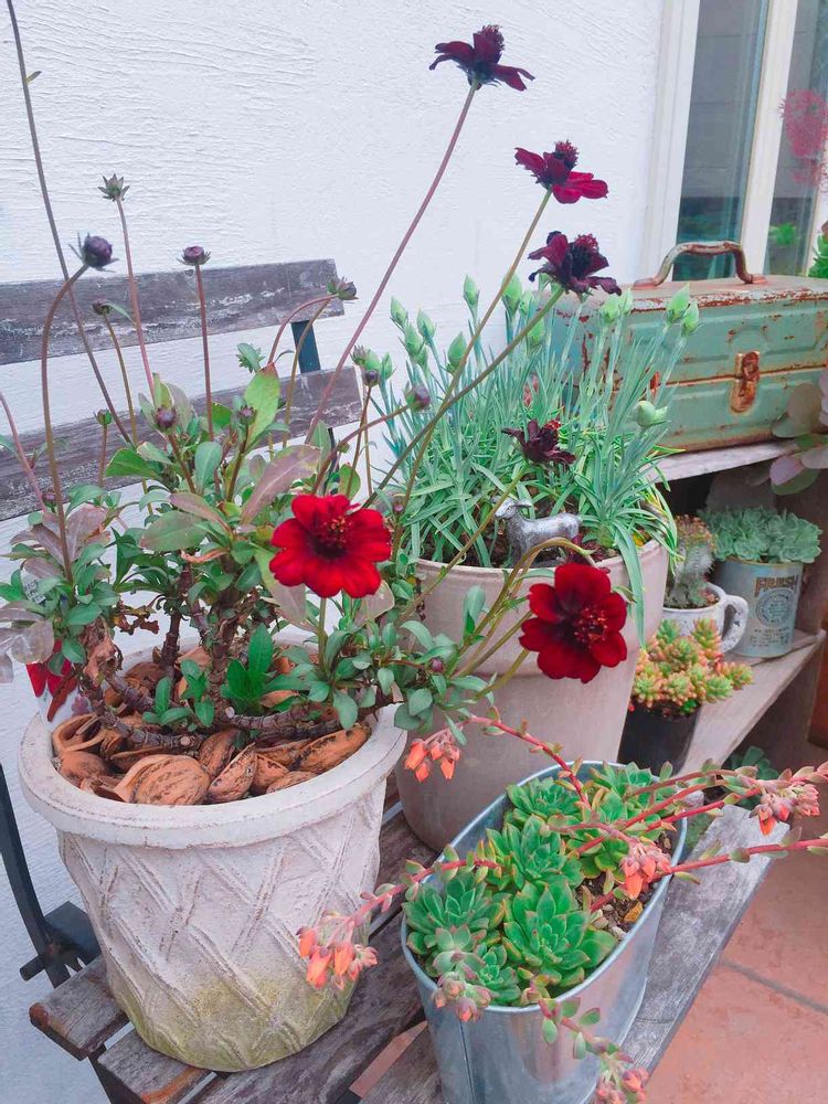 チョコレートコスモスも奥のサビサビも色褪せた椅子もみんな可愛いよー💕