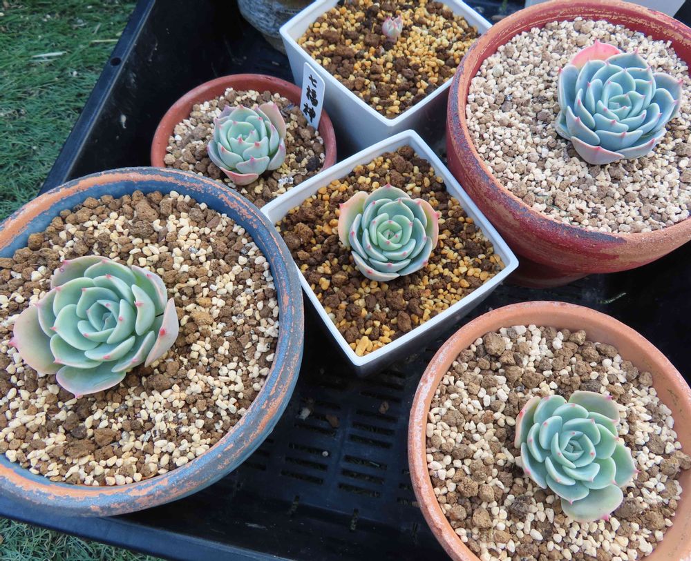 画像の七福神たちは、元は巨大に群生化した親株から切り離した子株なので、子供達ももしかしたら大きな群生株になるかも、と思って別々の鉢に植えました。