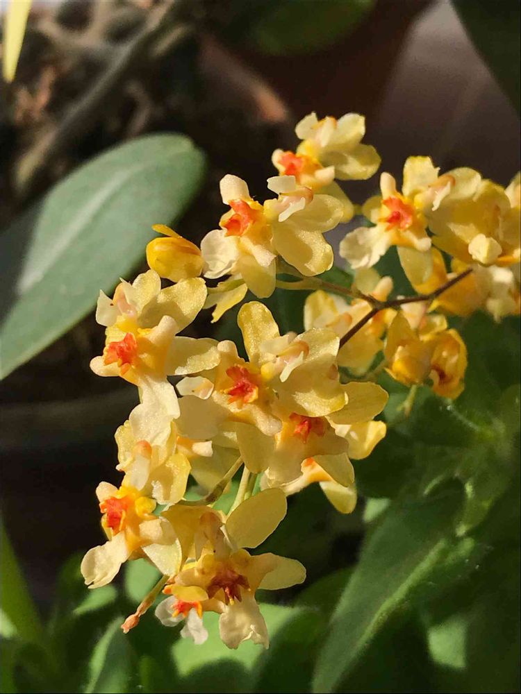 写真なので花の大きさは分かりづらいのですが、花一つの大きさは7mmほどでとても小さなランです。左側の葉っぱはファレノプシスです。