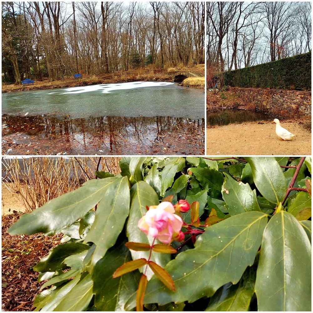 凍った池🥶⛄に映った木々のリフレクションも寒ざむしい庭❄️を元気に散歩している🎶アヒル君が可愛かったです😊💕