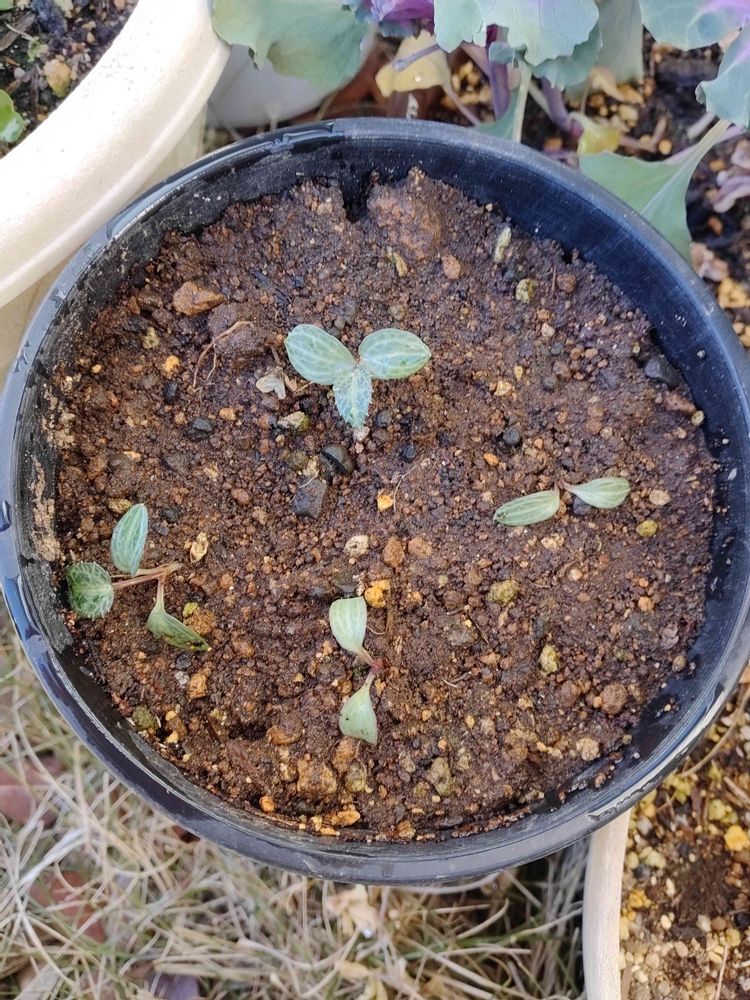 花壇にたくさん発芽してたのを、放ったらかしにしていたら、わずか4個に!大変だ😱😱無くならないうちに鉢に上げて保護。
