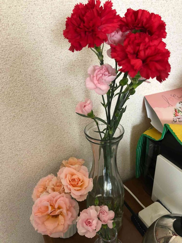 週末に頂いた母の日のカーネーションに鉢植え密集の為間引きした薔薇で観葉植物と多肉しかなかった家の中に花が一気に増えてます。