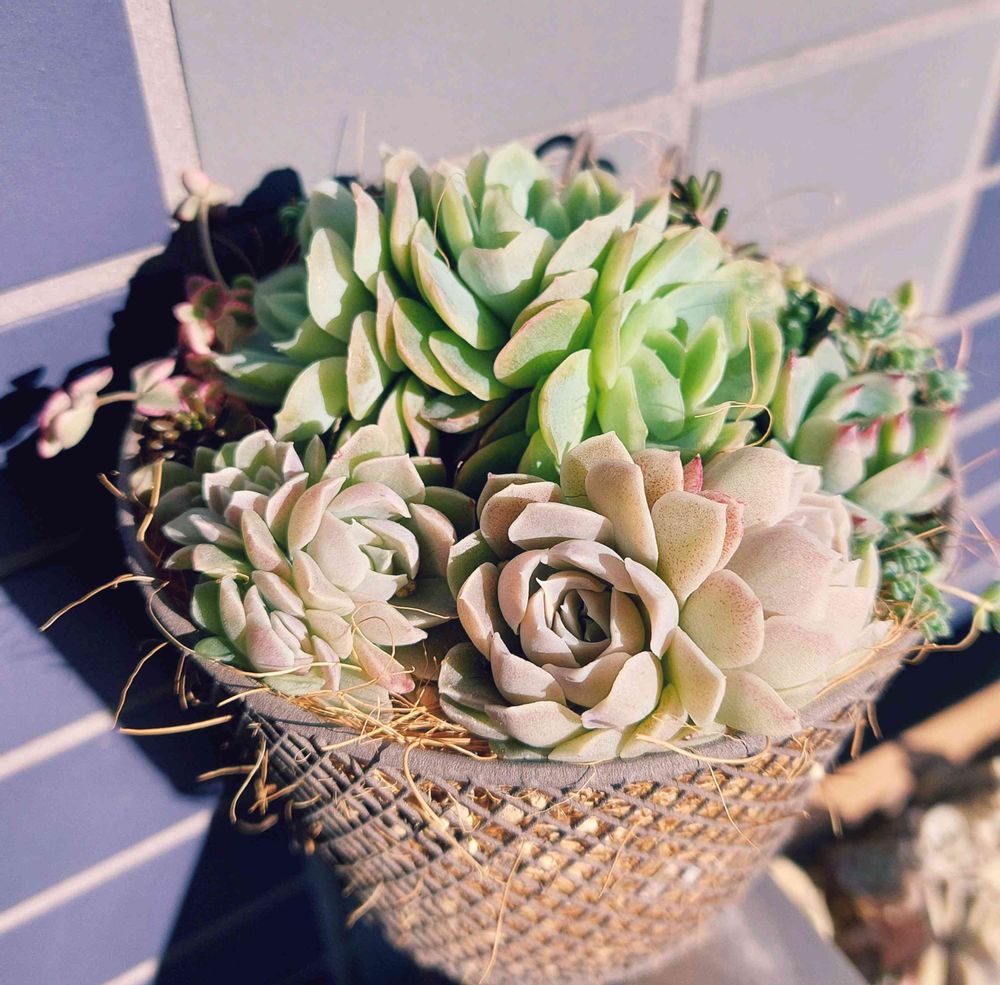 うちで増えたクリーム大福、水蜜桃と花束みたいに寄せ植してみました💐