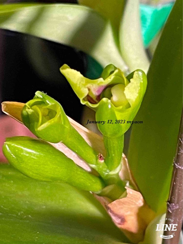 ミニカトレア・ヤンミンゴールデンボーイ(Rth.Shinfong Little Sun Yungmin Golden Boy)以前 九州の蘭園からプレゼントで頂いた株です。2輪ほど咲き急いでる?色が着く前にほころんでいます🤔ゆっくり咲いてくれていいのにね