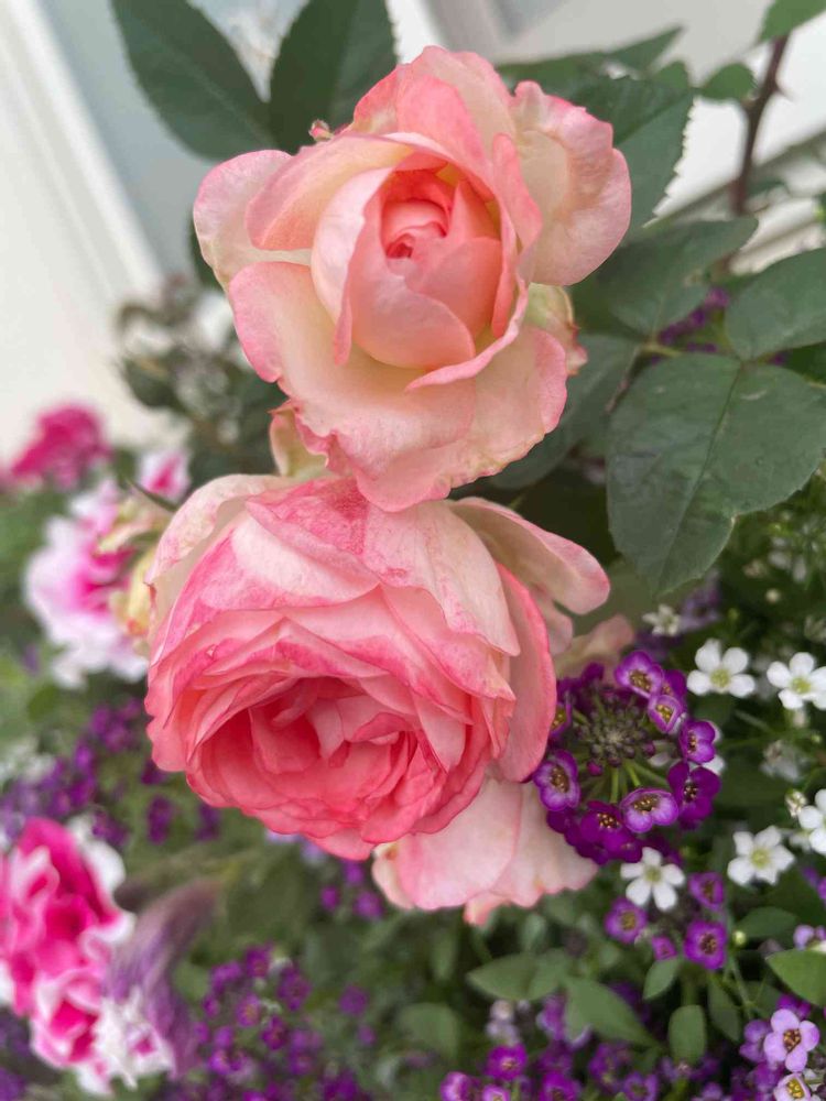 この寄せ植えには、ミニバラ2種×2入っています。どちらもミニバラとは思えない大輪のお花を咲かせています❀(*´▽`*)❀