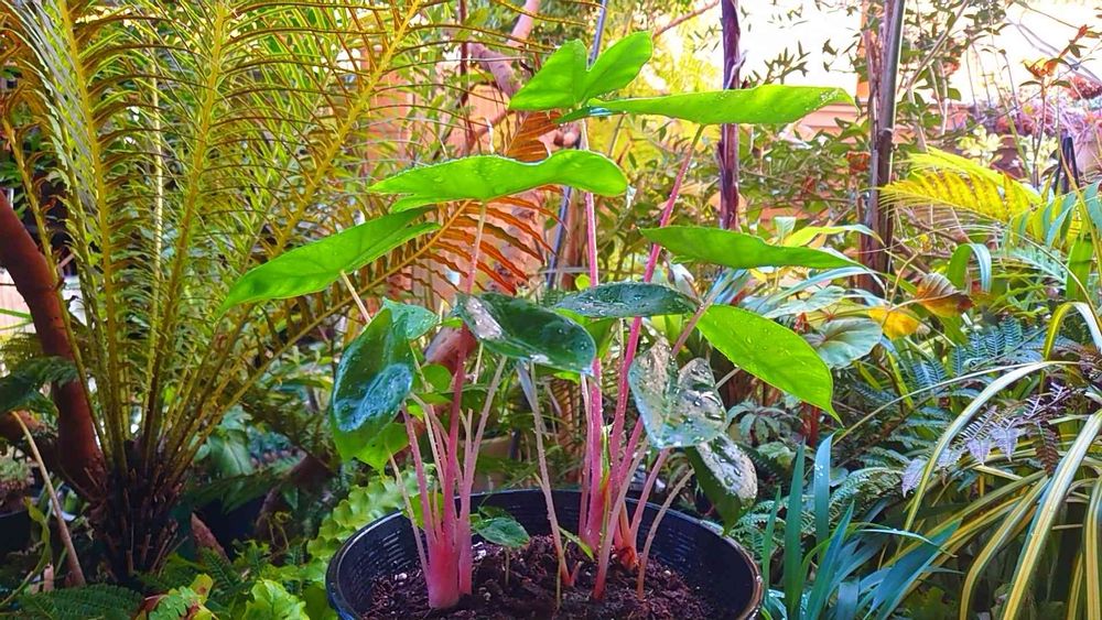 ピンクドラゴンと何が違うのか。一緒なんじゃないかという気もしますが、葉柄がピンクのアロカシア。小さいのがたくさん出ていてカワイイです。鉢増し完了。