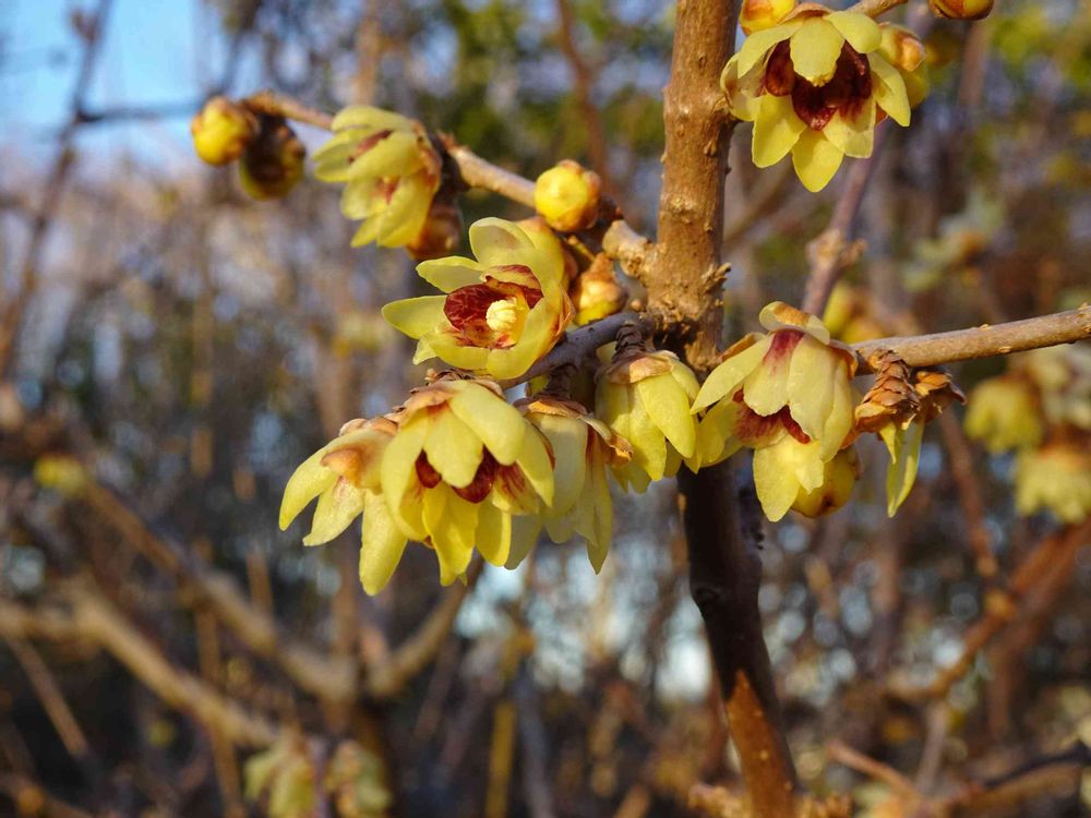 ロウバイにも色んな種類がありますが、こちらはロウバイの基本種で花の中心が暗い赤紫色で花弁は細目の和蝋梅です。