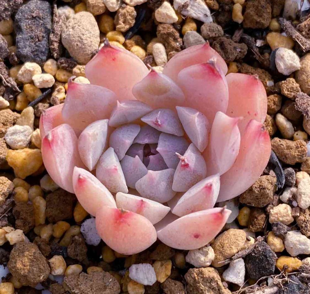 前にメルカリで何かちょこっとした多肉植物をお買いもんしたとき、出品者さんがこのピンクベラというエケベリアをおまけでいっしょに送ってくださったのですが、おまけというにはもったいないかわいらしさでびっくりしました。あれから少しだけ大きくなって、今はピンクのハートのようで本当に愛らしい姿です。はよ写真を撮らないと、暖かくなったらまたクリーム色がかった緑色に戻ってしまうと思ってシャッと撮りました。